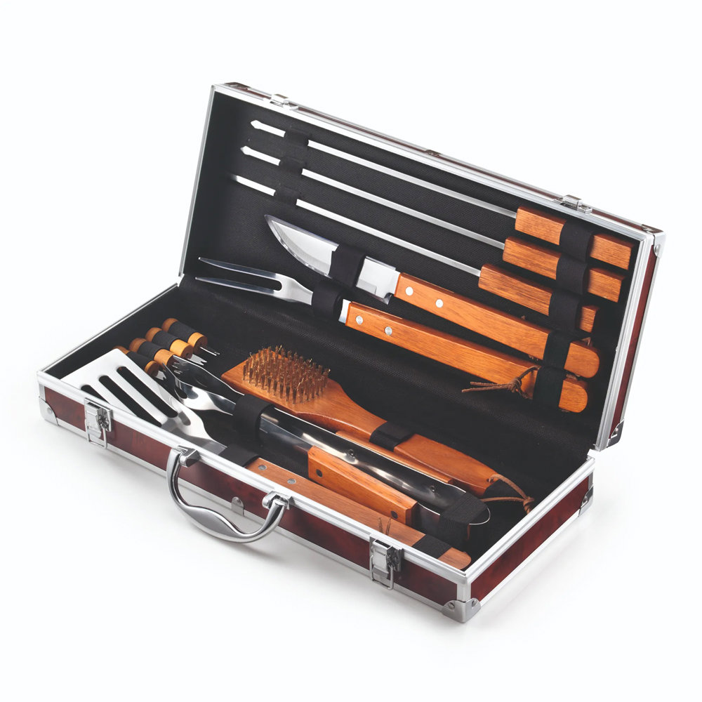 - SET VALIGETTA IN RADICA COMPOSTA DA 12 ACCESSORI IN ACCIAIO INOX CON MANICO IN LEGNO