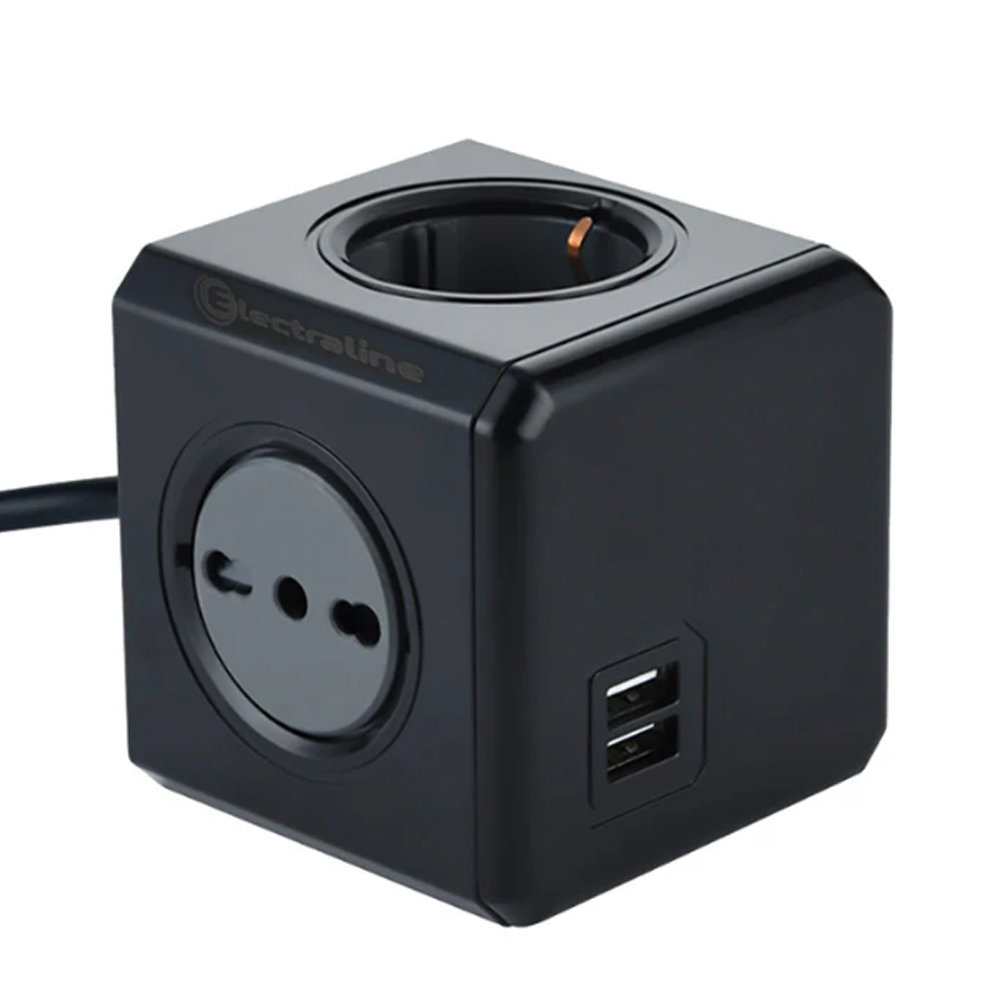 MULTIPRESA CUBO NERA CON 2 PRESE SCHUKO, 2 BIVALENTI E 2 USB ELECTRALINE