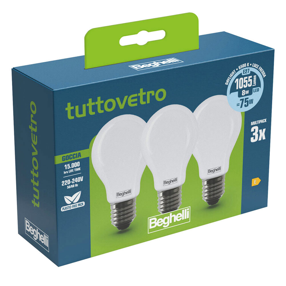 LAMPADINA LED TUTTOVETRO OPALINO A GOCCIA 8W 6,5K ATTACCO E27 CONFEZIONE 3 PZ BEGHELLI