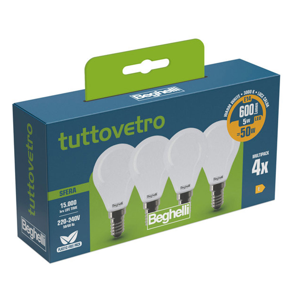 LAMPADINA LED TUTTOVETRO OPALINO A SFERA 5W 3K ATTACCO E14 CONFEZIONE 4 PZ BEGHELLI